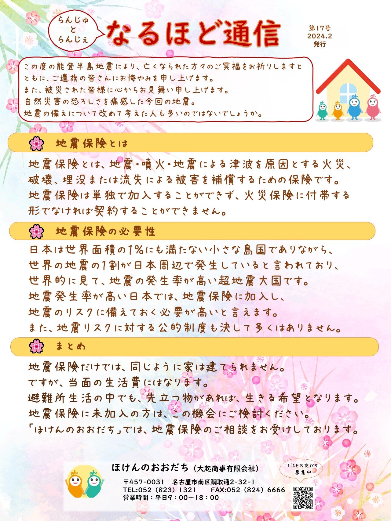 能登半島地震の被害に遭われた方、心よりお見舞い申し上げます。 皆さん、地震保険は加入されていますか? 弊社のお客様には、89.1%の方にご加入頂いております。 (愛知県全体の付帯率 76.6%) 地震が来たからと言って必 […]